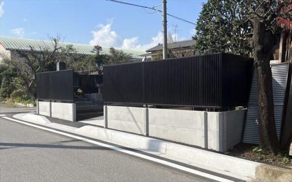 フェンスウォールⓇフラットの【2番】(地上高さ~700まで)を使用、道路側と敷地側に高低差がある為、柵板は土留め仕様で【土圧板】になっています。この位の高さであれば1スパンを2メートルで施工する事も可能ですが、この工事現場ではより安全な土留め施工として1スパンを1メートルで施工しています。